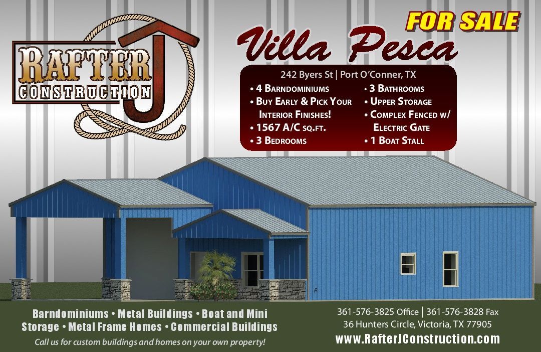 Inquire now about space in Rafter J Construction's new barndominium community, Villa Pesca! Located in Port O'Connor, TX, Villa Pesca will offer the perfect "home away from home" for all prospective buyers! Each barndominium complex will be an unmatched refuge for those that need substantial storage space along with a full, comfortable living space to work, eat, sleep, and play while away from home! Villa Pesca barndominium complexes will come standard with: